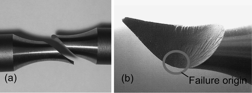 - Sachant qu’en rupture fragile, la surface de rupture est souvent perpendiculaire à la direction principale associée à la contrainte principale maximale, expliquer le faciès de rupture présenté à la figure ci-dessous.